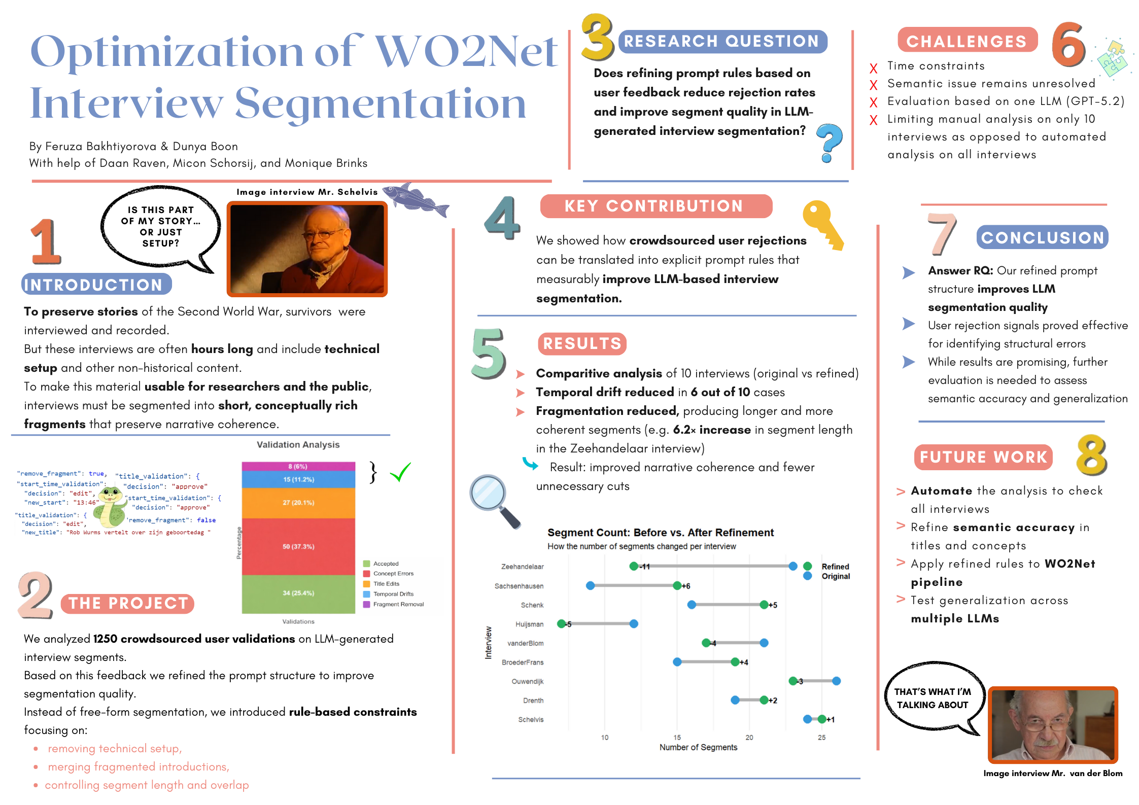 Verder zijn we blij dat wij deze kans hebben gekregen om met een fijne organisatie als WO2Net samen te mogen werken. Onze resultaten geven een indicatie voor verfijnde resultaten met betrekking tot LLM-gegenereerde interviewsegmentaties. Ondanks de begrenzingen van ons project zijn dit resultaten waarop kan worden voortgeborduurd.”