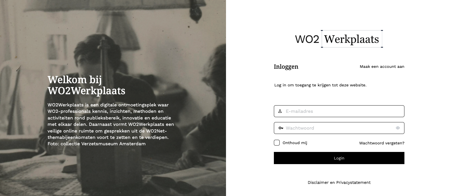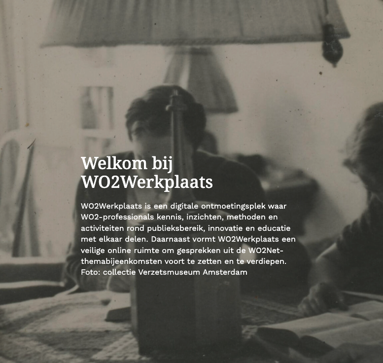 De gesprekken die tijdens onze themabijeenkomsten ontstaan, verdienen een vervolg. Daarom is er WO2Werkplaats – een virtuele, veilige omgeving waar professionals uit het WO2-veld elkaar kunnen ontmoeten, ideeën kunnen uitwisselen en samen kunnen werken aan actuele vraagstukken.