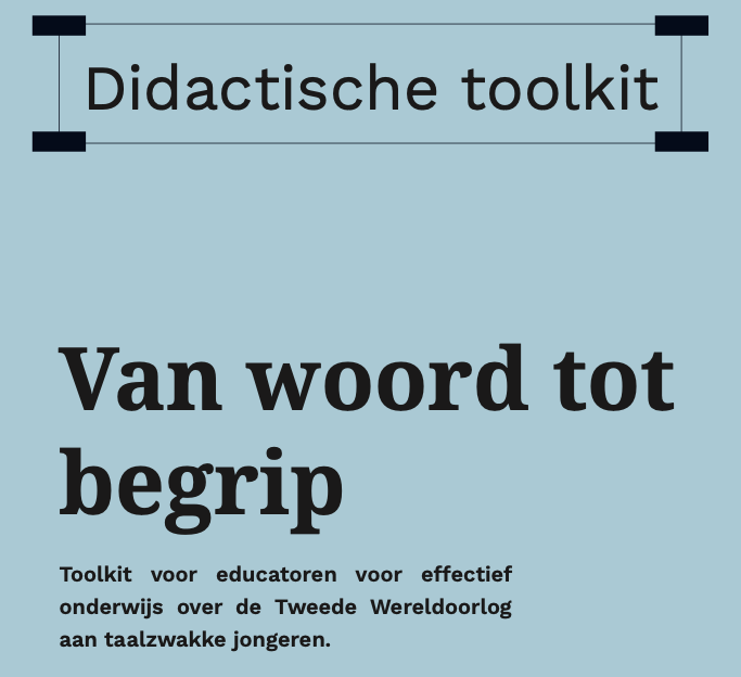 Stichting WO2Net en het Nationaal Comité 4 en 5 mei willen met deze toolkit voor educatoren het bestaande en toekomstige lesmateriaal over de Tweede Wereldoorlog, herdenken en vieren beter toegankelijk maken voor taalzwakke jongeren. Deze tool helpt hen bij het ontwikkelen van een educatief programma over de Tweede Wereldoorlog, met speciale aandacht voor taalzwakke jongeren van 12 tot 18 jaar.